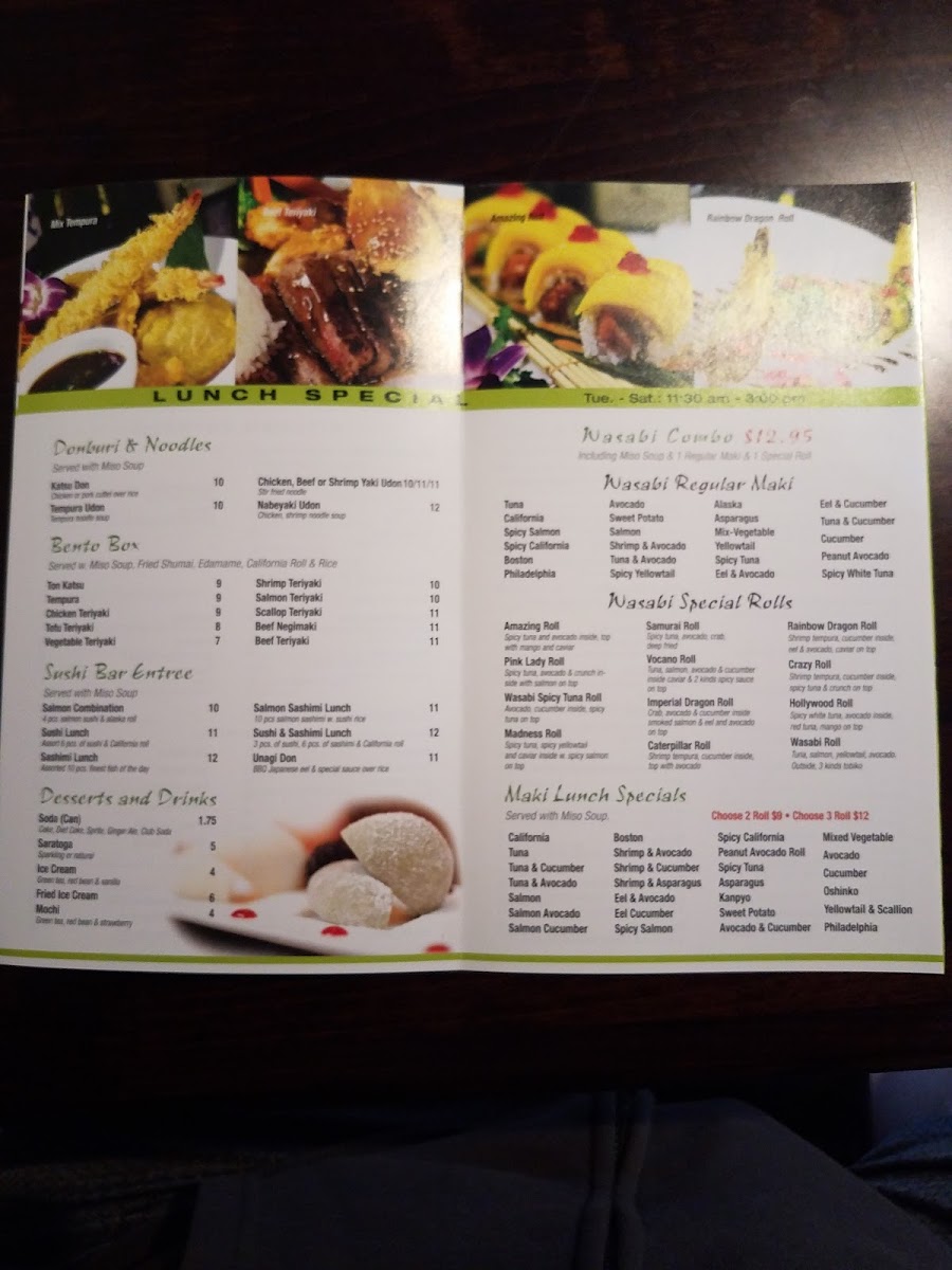 Wasabi Sushi offers an extensive and diverse menu catering to a wide range of tastes and preferences. Their Lunch Specials are an excellent choice, with options like the Salmon Combination Lunch Special, Sushi Lunch Special, and Sashimi Lunch Special. For those craving something heartier, the Katsu Don Lunch Special and Tempura Udon Lunch Special stand out. The Bento Box Lunch Special includes favorites such as Ton Katsu Lunch Special and Chicken Teriyaki Lunch Special. If you're looking for variety, the Wasabi Combo Lunch Special is a great option. The restaurant also serves a selection of Maki Rolls, including the 2 Maki Rolls Lunch Special and 3 Maki Rolls Lunch Special. In addition to these, the menu features tempting appetizers like Edamame and Gyoza, along with soups and salads, such as Miso Soup and Seaweed Salad.